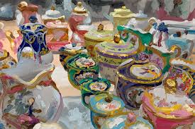 I temi affrontati dall’artista belga sono molteplici ma oggi vorrei soffermarmi su uno in particolare, assolutamente nuovo ed originale: la rappresentazione su tela di antichi e pregiati servizi di porcellana, piatti, bicchieri di cristallo e argenterie che Jan ha avuto occasione di fotografare nei vari musei e castelli che ha visitato in Belgio e all’estero, come Versailles, il Castello di Schönbrunn a Vienna o il Victoria and Albert Museum di Londra.